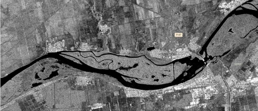 After comparing two SAR images — before and after the destruction of the Kakhovka Hydroelectric Power Plant — significant changes in the water system and surrounding areas are clearly visible. In the “before” image, the water level in the reservoir remained stable: the Dnipro riverbed and water surface appeared as uniform dark areas with distinct shorelines. The coastal zones were narrow, without signs of flooding, and agricultural fields and settlements retained their usual structure and brightness depending on the season. In the “after” image, the situation changed dramatically. In the upper part, where the reservoir previously extended, a sharp shallowing is noticeable: the dark water surface significantly decreased, and in its place appeared large light areas — exposed bottom with sand and silt. Downstream, the opposite effect is observed — large-scale flooding. The river overflowed its banks, and vast areas of fields, riverside villages, and urban quarters turned into dark patches typical of water. Roads and infrastructure partly disappeared under flooded areas, and the structure of farmland changed: the flooded fields lost their characteristic texture and appear uniformly dark.